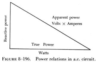 In a dc circuit, power is obtained by the equation, P = EI, (watts equal volts times amperes). Thus, if 1 ampere of current flows in a circuit at a pressure of 200 volts, the power is 200 watts. The product of the volts and the amperes is the true power in the circuit. In an ac circuit, a voltmeter indicates the effective voltage and an ammeter indicates the effective current. The product of these two readings is called the apparent power. Only when the ac circuit is made up of pure resistance is the apparent power equal to the true power (figure 8-196). |