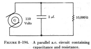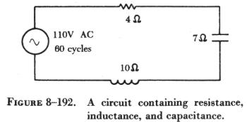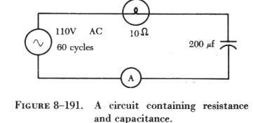 In figure 8-191, a series circuit is illustrated in which a capacitor of 200 mf is connected in series with a 10 ohm lamp. What is the value of the impedance, the current flow, and the voltage drop across the lamp? |