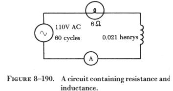 This formula can be used to determine the impedance when the values of inductive reactance and resistance are known. It can be modified to solve for impedance in circuits containing capacitive reactance and resistance by substituting XC in the formula in place of XL. In circuits containing resistance with both inductive and capacitive reactance, the reactances can be combined, but because their effects in the circuit are exactly opposite, they are combined by subtraction: X = XL - XC or X = XC - XL (the smaller number is always subtracted from the larger). In figure 8-190, a series circuit consisting of resistance and inductance connected in series is connected to a source of 110 volts at 60 cycles per second. The resistive element is a lamp with 6 ohms resistance, and the inductive element is a coil with an inductance of 0.021 henry. What is the value of the impedance and the current through the lamp and the coil?