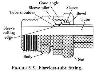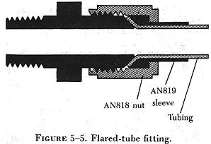 The male fitting has a cone shaped surface with the same angle as the inside of the flare. The sleeve supports the tube so that vibration does not concentrate at the edge of the flare, and distributes the shearing action over a wider area for added strength. Tube flaring and the installation of flared tube fittings are discussed in detail later in this chapter. |
