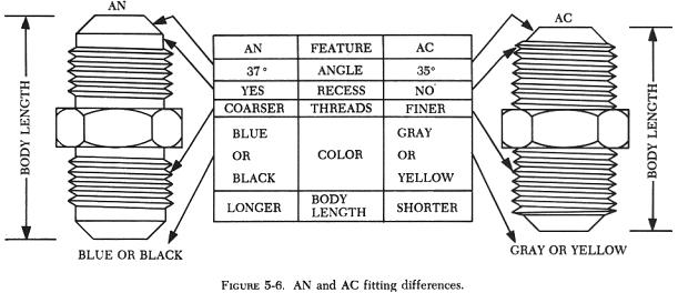 The AC (Air Corps) flared tube fittings have been replaced by the AN (Army/Navy) Standard and MS (Military Standard) fittings. However, since AC fittings are still in use in some of the older aircraft, it is important to be able to identify them. The AN fitting has a shoulder between the end of the threads and the flare cone. (See figure 5-6.) The AC fitting does not have this shoulder.