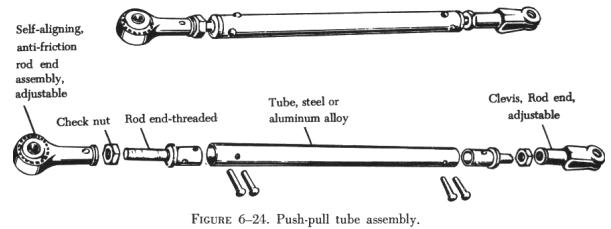 A push-pull tube assembly consists of a hollow aluminum alloy or steel tube with an adjustable end fitting and a checknut at either end. (See figure 6-24.) The checknuts secure the end fittings after the tube assembly has been adjusted to its correct length. Push-pull tubes are generally made in short lengths to prevent vibration and bending under compression loads.