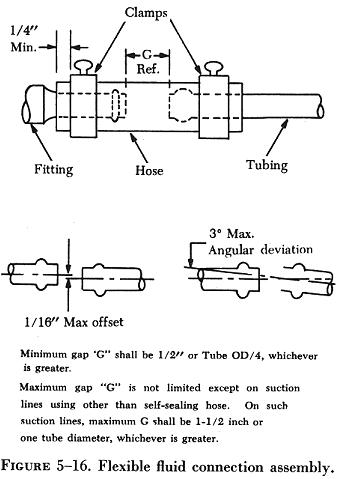 When repairing a damaged line, be very careful to remove all chips and burrs. Any open line that is to be left unattended for some time should be sealed, using metal, wood, rubber, or plastic plugs or caps. When repairing a low pressure line using a flexible fluid connection assembly, position the hose clamps carefully in order to prevent overhang of the clamp bands or chafing of the tightening screws on adjacent parts. If chafing can occur, the hose clamps should be repositioned on the hose. Figure 5-16 illustrates the design of a flexible fluid connection assembly and gives the maximum allowable angular and dimensional offset. Layout of Lines Remove the damaged or worn assembly, taking care not to further damage or distort it, and use it as a forming template for the new part. If the old length of tubing cannot be used as a pattern, make a wire template, bending the pattern by hand as required for the new assembly. Then bend the tubing to match the wire pattern. Never select a path that does not require bends in the tubing. |