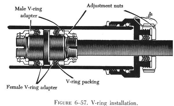 V-ring packings (AN6225) are one-way seals and are always installed with the open end of the "V" facing the pressure. V-ring packings must have a male and female adapter to hold them in the proper position after installation. It is also necessary to torque the seal retainer to the value specified by the manufacturer of the component being serviced, or the seal may not give satisfactory service. An installation using V-rings is shown in figure 6-57.
