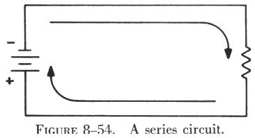 | The series circuit is the most basic of electrical circuits. All other types of circuits are elaborations or combinations of series circuits. Figure 8-54 is an example of a simple series circuit. It is a circuit because it provides a complete path for current to flow from the negative to the positive terminal of the battery. It is a series circuit because there is only one possible path in which current can flow, as indicated by the arrows showing the direction of electron movement. It is also called a series circuit because current must pass through the circuit components, the battery and the resistor, one after the other, or "in series." |