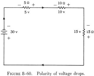 | In the statements of Kirchhoff's laws, the term algebraic sum was used. An algebraic sum differs from an arithmetic sum in that both the magnitude and the sign of each number must be considered. In electrical circuits a voltage drop occurs when current flows through a resistor. The magnitude of the voltage is determined by the size of the resistor and the amount of current flow. The polarity (sign) of the voltage drop is determined by the direction of the current flow. For example, observe the polarities of the applied electromotive force (e.m.f) and the voltage drop as shown in figure 8-60. The applied e.m.f. causes electrons to flow through the opposition offered by the resistances. The voltage drop across each resistance is therefore opposite in polarity to that of the applied e.m.f. Note that the side of each resistor where the current enters is labeled the negative side. |