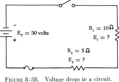 Since there are two resistances in the circuit, there will be two separate voltage drops. These two voltage drops will be the loss in electrical pressure used to force electrons through the resistances. The amount of electrical pressure required to force a given number of electrons through a resistance is proportional to the size of the resistance. Thus, the voltage drop across R1 will be twice that across R2 since R1 has two times the resistance value of R2. The drop across R1 is labeled E1, and that across R2 is E2. The current, I, is the same throughout the circuit. |