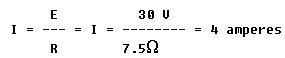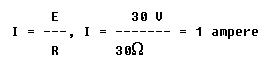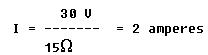 The Ohm's law formula for finding current is I = E/R. Since the battery voltage is 30 volts and the total circuit resistance is 15 ohms, the equation becomes
