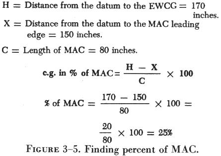 The location of the MAC, in relation to the datum, is given in the Aircraft Specifications or Type Certificate Data Sheets, the weight and balance report, or the aircraft flight manual. Compute the CG location in percent of MAC as follows: