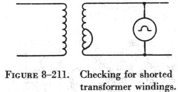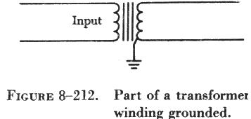 In figure 8-212 one point on a transformer winding is shown connected to ground. If the external circuit of the transformer circuit is grounded, a part of the winding is effectively shorted. A megger connected between one side of the winding and the transformer case (ground) will verify this condition with a low or zero reading. In such a case, the transformer must be replaced.