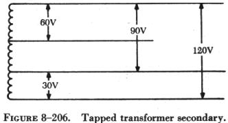 This type of transformer connection is used extensively on aircraft because of the combinations of voltages that can be taken from one transformer. Various voltages can be picked off the secondary winding of the transformer by inserting taps (during manufacture) at various points along the secondary windings. The various amounts of voltage are obtained by connecting to any two taps or to one tap and either end. |