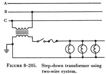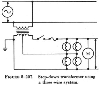 Three phase motors and other three phase loads are connected with their coils or load elements arranged so that three transmission lines are required for delivery of power. Transformers that are used for stepping the voltage up or down in a three phase circuit are electrically connected so that power is delivered to the primary and taken from the secondary by the standard three wire system. |