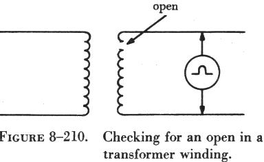 There are occasions when a transformer must be checked for opens or shorts, and it is often necessary to determine that a transformer is a step up or step down transformer. An open winding in a transformer can be located by connecting an ohmmeter as shown in figure 8-210. Connected as shown, the ohmmeter would read infinity. If there were no open in the coil, the ohmmeter would indicate the resistance of wire in the coil. Both primary and secondary can be checked in the same manner. |