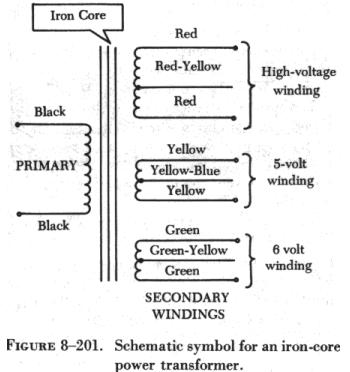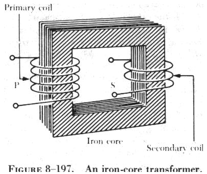 A transformer consists of three basic parts, as shown in figure 8-197. These are an iron core which provides a circuit of low reluctance for magnetic lines of force, a primary winding which receives the electrical energy from the source of applied voltage, and a secondary winding which receives electrical energy by induction from the primary coil. |