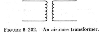 (2) Audio transformers resemble power transformers. They have only one secondary and are designed to operate over the range of audio frequencies (20 to 20,000 cps). (3) RF transformers are designed to operate in equipment that functions in the radio range of frequencies. The symbol for the RF transformer is the same as for an RF choke coil. It has an air core as shown in figure 8-202.
