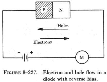 Connecting the battery as shown in figure 8-227 causes the holes and electrons to be pulled away from the junction, and little interaction between holes and electrons occurs at the junction. This results in very little current flow, called reverse current.