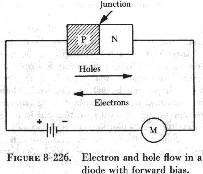 Diodes Figure 8-226 illustrates a germanium diode and consists of two different types of semiconductor materials. With the battery connected as shown, positive holes and electrons are repelled by the battery toward the junction, causing an interaction between the holes and electrons. This results in electrons flowing through the junction to the holes and to the positive terminal of the battery. The holes move toward the negative terminal of the battery. This is called the forward direction and is a "high" current. |