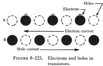 In B of figure 8-225, the electrons have moved one space to the left of their position occupied in A of figure 8-225. In effect, the holes have, therefore, moved one space to the right. |