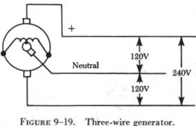 Some dc generators, called three wire generators, are designed to deliver 240 volts, or 120 volts from either side of a neutral wire (figure 9-19). This is accomplished by connecting a reactance coil to opposite sides of the commutator, with the neutral connected to the midpoint of the reactance coil. Such a reactance coil acts as a low loss voltage divider. If resistors were used, the IR loss would be prohibitive unless the two loads were perfectly matched. The coil is built into some generators as part of the armature, with the midpoint connected to a single slip ring which the neutral contacts by means of a brush. In other generators, the two connections to the commutator are connected, in turn, to two slip rings, and the reactor is located outside the generator. |
