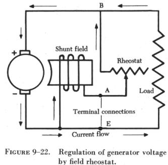 The terminal voltage of a shunt generator can be controlled by means of a rheostat inserted in series with the field windings as shown in A of figure 9-16. As the resistance is increased, the field current is reduced; consequently, the generated voltage is reduced also. For a given setting of the field rheostat, the terminal voltage at the armature brushes will be approximately equal to the generated voltage minus the IR drop produced by the load current in the armature; thus, the voltage at the terminals of the generator will drop as the load is applied. Certain voltage sensitive devices are available which automatically adjust the field rheostat to compensate for variations in load. When these devices are used, the terminal voltage remains essentially constant.