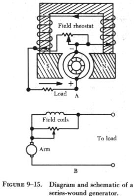 Series Wound DC Generators The field winding of a series generator is connected in series with the external circuit, called the load (figure 9-15). The field coils are composed of a few turns of large wire; the magnetic field strength depends more on the current flow rather than the number of turns in the coil. Series generators have very poor voltage regulation under changing load, since the greater the current through the field coils to the external circuit, the greater the induced e.m.f. and the greater the terminal or output voltage. Therefore, when the load is increased, the voltage increases; likewise, when the load is decreased, the voltage decreases. The output voltage of a series wound generator may be controlled by a rheostat in parallel with the field windings, as shown in A of figure 9-15. Since the series wound generator has such poor regulation, it is never employed as an airplane generator. Generators in airplanes have field windings which are connected either in shunt or in compound. |