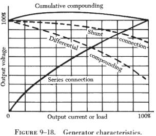 If the shunt field of a compound generator is connected across both the armature and the series field, it is known as a long shunt connection, but if the shunt field is connected across the armature alone, it is called a short shunt connection. These connections produce essentially the same generator characteristics. A summary of the characteristics of the various types of generators discussed is shown graphically in figure 9-18. |