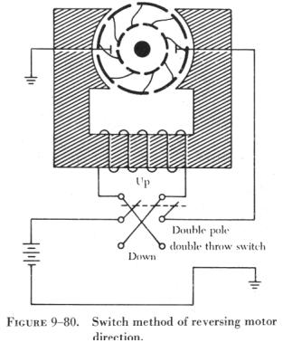 | One method for reversing direction of rotation employs two field windings wound in opposite directions on the same pole. This type of motor is called a split field motor. Figure 9-79 shows a series motor with a split field winding. The single pole, double throw switch makes it possible to direct current through either of the two windings. When the switch is placed in the lower position, current flows through the lower field winding, creating a north pole at the lower field winding and at the lower pole piece, and a south pole at the upper pole piece. When the switch is placed in the upper position, current flows through the upper field winding, the magnetism of the field is reversed, and the armature rotates in the opposite direction. Some split field motors are built with two separate field windings wound on alternate poles. The armature in such a motor, a four pole reversible motor, rotates in one direction when current flows through the windings of one set of opposite pole pieces, and in the opposite direction when current flows through the other set of windings. |