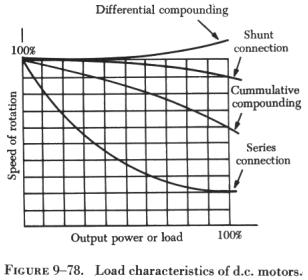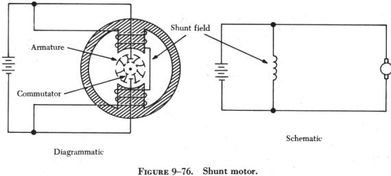 The compound motor is a combination of the series and shunt motors. There are two windings in the field: a shunt winding and a series winding. A schematic of a compound motor is shown in figure 9-77. The shunt winding is composed of many turns of fine wire and is connected in parallel with the armature winding. The series winding consists of a few turns of large wire and is connected in series with the armature winding. The starting torque is higher than in the shunt motor but lower than in the series motor. Variation of speed with load is less than in a series wound motor but greater than in a shunt motor. The compound motor is used whenever the combined characteristics of the series and shunt motors are desired.