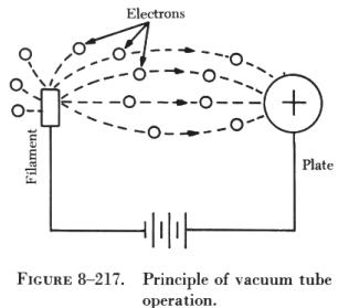 When a piece of metal is heated, the speed of the electrons in the metal is increased. If the metal is heated to a high enough temperature, the electrons are accelerated to the point where some of them actually leave the surface of the metal, as shown in figure 8-217. In a vacuum tube, electrons are supplied by a piece of metal, called a cathode, which is heated by an electric current. Within limits, the hotter the cathode the greater the number of electrons it will give off or emit.