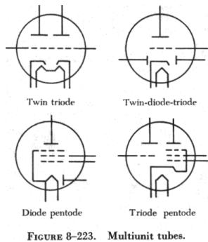 For example, some tubes are sensitive to red light, others to blue light. In most phototubes, the cathode resembles a half cylinder. It is covered with multiple layers of the rare metal, cesium, overlaid on cesium oxide, which, in turn, lies on a layer of silver. The plate is shaped like a small rod and is located in the center of the cathode. Other types of vacuum tubes include those with the characteristics of several tubes incorporated into one, as shown in figure 8-223. Among these, for example, are twin triode tubes containing two triode sections, in a single tube envelope, and diode-triode tubes with a rectifier diode and an amplifier triode in the same envelope. There are many other tube combinations. |