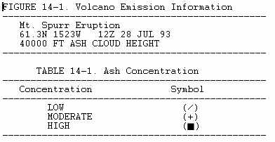 The four panels in any column are valid for the same time interval (specified and located below the third panel). The top three panels in each column provide the ash location and relative concentrations for an atmospheric layer, identified by top and bottom flight levels. The highest layer is at the top of the chart. The bottom panels are the total ash concentrations from the surface up through flight level 550. Volcano eruption information is given at the lower left (See Figure 14-1) which includes the volcano name (with location symbol), latitude and longitude, eruption date and time, and initial ash cloud height. The legend for relative concentrations (see Table 14-1) is at the lower right corner of the chart. A relative concentration symbol on a map reflects a maximum forecast value at a location during the time interval.
