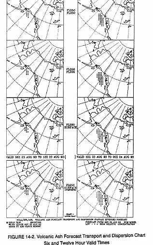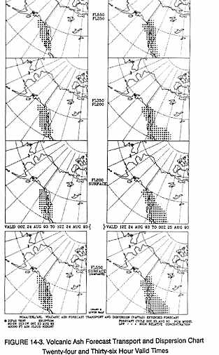 The Volcanic Ash Forecast Transport and Dispersion (VAFTAD) Chart, Figures 14-2 and 14-3, is generated by a 3-dimensional time-dependent dispersion model developed by NOAA's Air Resources Laboratory (ARL). The VAFTAD model focuses on hazards to aircraft flight operations caused by a volcanic eruption with an emphasis on the ash cloud location in time and space. It uses National Meteorological Center (NMC) forecast data to determine the location of ash concentrations over 6-hour and 12-hour time intervals, with valid times beginning 6, 12, 24, and 36 hours following a volcanic eruption. The output is made available on graphics distribution networks supported by the NWS. This computer-prepared chart is not issued on a routine basis. Rather, it is issued as volcanic eruptions are reported.