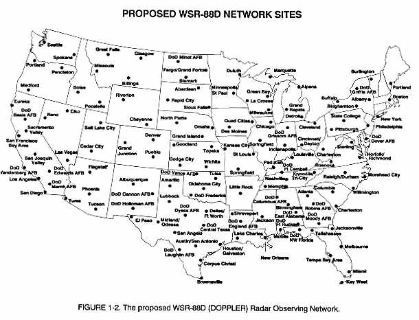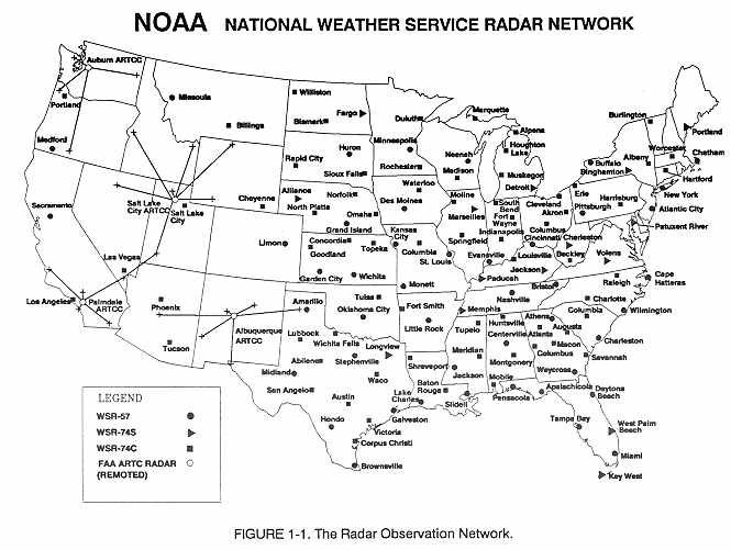 A radar summary chart, Figure 7-1, graphically displays a collection of radar weather reports (SDs). Figures 1-1 and 1-2 depict the National Weather Service radar network. This computer-generated chart is constructed from regularly scheduled radar observations and is valid at the time of the reports (H+35), i.e., 35 minutes past each hour. These charts are available between 16 and 24 hours daily depending on the system being used. The chart displays the type of precipitation echoes, their intensity, intensity trend, configuration, coverage, echo tops and bases, and movement. Severe weather watches are plotted if they are in effect when the chart is valid.