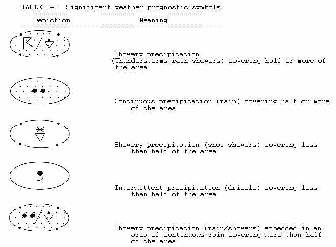 Significant weather prognostic charts, called "progs" for brevity, portray forecast weather which may influence flight planning. Table 8-1 explains some symbols used on these charts. Significant weather progs are issued both for domestic and international flights.