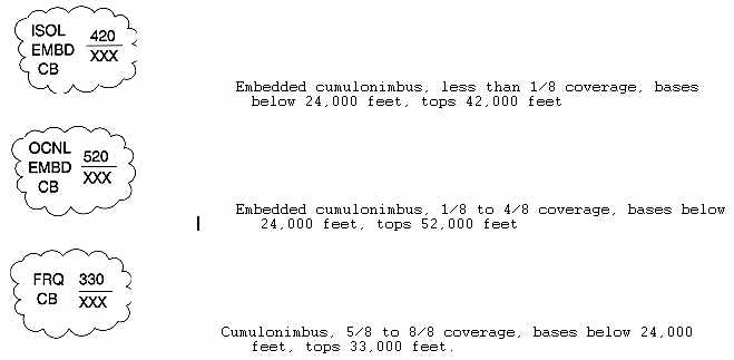 CB data will normally be identified as ISOL EMBD CB (isolated embedded CB), OCNL EMBD CB (occasional embedded CB), ISOL CB in HAZE (isolated CB in haze), or OCNL CB in HAZE (occasional CB in haze). In rare instances, CB coverage above FL240 may exceed 4/8 coverage; in these instances, CB activity will be described as FRQ CB (frequent cumulonimbus with little or no separation). The meanings of these area coverage terms are: ISOL (less than 1/8), OCNL (1/8 to 4/8) and FRQ (5/8 to 8/8).