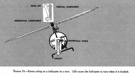 Turns are made in a helicopter, as in an airplane, by banking. In forward flight, the rotor disc is tilted forward which also tilts the total lift-thrust force of the rotor disc forward. This total force is the resultant of a vertical component, lift, and a horizontal component, thrust, acting forward. When the helicopter is placed in a bank, the rotor disc is tilted sideward. This causes the lift component to be tilted sideward, which in turn, is divided into two components - one acting vertically that opposes weight, the other acting horizontally to the side and opposes centrifugal force (fig. 24). It is this horizontal component of lift that pulls the helicopter in the direction of bank and thus causes it to turn. Briefly then, we can say that a turn is produced by banking the helicopter, thus allowing the lift of the rotor disc to pull the helicopter from its straight course.