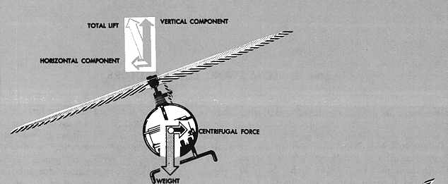 As the angle of bank increases, the total lift force is tilted more toward the horizontal, thus causing the rate of turn to increase because more lift is acting horizontally. Since the resultant lifting force acts more horizontally, the effect of lift acting vertically (vertical component) is decreased (fig. 25). To compensate for this decreased vertical lift, the angle of attack of the rotor blades must be increased in order to maintain altitude. The steeper the angle of bank, the greater the angle of attack of the rotor blades required to maintain altitude. Thus, with an increase in bank and a greater angle of attack, the resultant lifting force will be increased and the rate of turn will be faster.