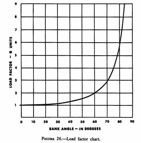 The load factor and, hence, apparent gross weight increase is relatively small in banks up to 30° (fig. 26). Even so, under the right set of adverse circumstances, such as high-density altitude, gusty air, high gross weight, and poor pilot technique, sufficient power may not be available to maintain altitude and airspeed. Above 30° of bank, the apparent increase in gross weight soars. At 30° of bank, the apparent increase is only 16 percent, but at 60°, it is 100 percent (fig. 26).
