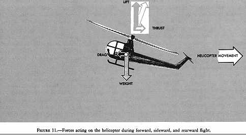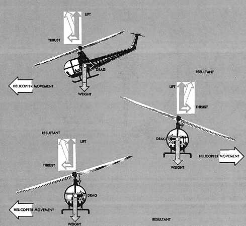 The thrust of the tail rotor is dependent upon the pitch angle of the tail rotor blades and, to a certain extent, upon the main rotor RPM. (For this particular discussion, we will assume that the main rotor RPM remains constant.) The pitch angle of the tail rotor blades determines the size of the bite of air the blades take as they rotate. The tail rotor may have a positive pitch angle, that is, the rotor bites the air to the right which tends to pull the tail to the right; or it may have a negative pitch angle in which case the rotor bites the air to the left, tending to pull the tail to the left; or it may have zero pitch, in which case it produces no thrust in either direction.