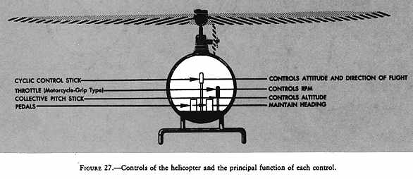 There are four controls in the helicopter that the pilot must use during flight (fig. 27). They are (1) collective pitch control; (2) throttle control; (3) antitorque pedals (auxiliary or tail rotor control); and (4) cyclic pitch control.