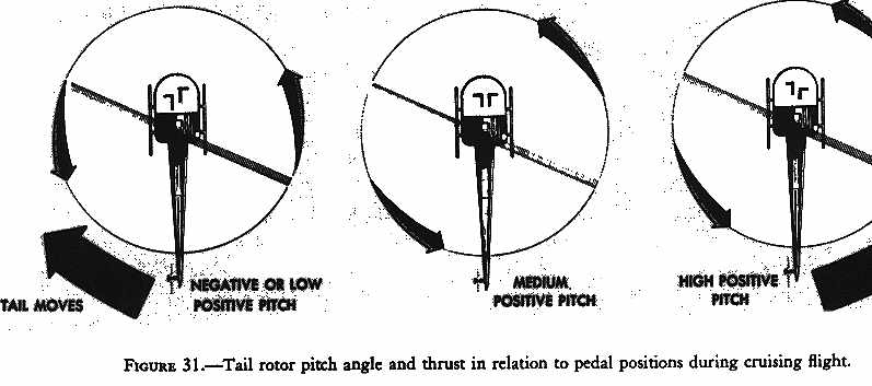 With a negative pitch angle, the tail rotor thrust is working in the same direction as torque reaction of the main rotor. With a small positive pitch angle, the tail rotor does not produce sufficient thrust to overcome the torque effect of the main rotor during cruising flight. Therefore, if the right pedal is displaced forward of neutral during cruising flight, the tail rotor thrust will not overcome the torque effect and the nose will yaw to the right (fig. 31, left).