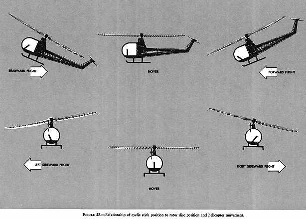The rotor disc tilts in the direction that pressure is applied to the cyclic. If the cyclic stick is moved forward, the rotor disc tilts forward; if the cyclic is moved aft, the rotor disc tilts aft, and so on (fig. 32).