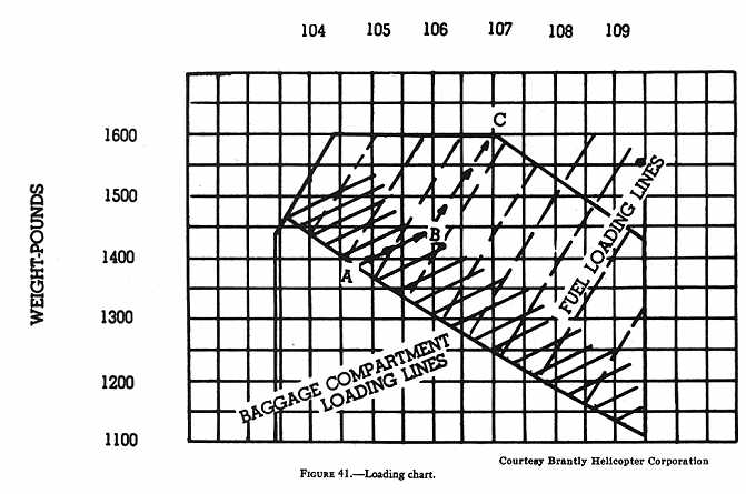 Weight and loading distribution. - This section must include rotorcraft weights and center-of-gravity limits, together with the items of equipment on which the empty weight is based. This will generally require the inclusion of a chart or graph such as that illustrated in figure 41 from which the pilot can compute the center-of-gravity position for any given loading situation.