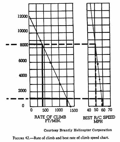 The chart in figure 42 is an example taken from one manual from which rates of climb and best rate of climb airspeed can be computed. It can be used to compute the rate of climb for various density altitudes. The steps are as follows: