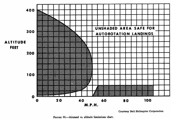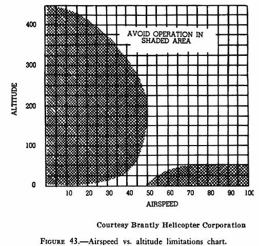 Limiting heights and corresponding speeds for safe landing after power failure are generally incorporated in a chart called the Airspeed vs. Altitude Limitations Chart, but often referred to as the Height-Velocity Curve or Diagram. This chart generally appears in the performance section of the helicopter flight manual, but occasionally may be found in the Operating Limitations section. Figures 43 and 44 represent such charts. These charts will be discussed in detail in a later chapter.