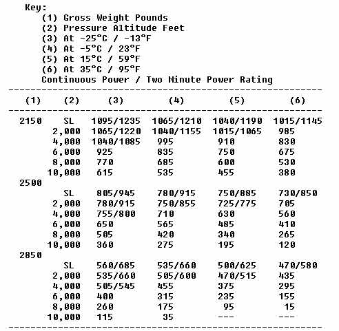 Tests on this particular helicopter showed that 1 inch of manifold pressure was equivalent to 6 horsepower (HP), and that 1 HP would lift 13.5 pounds of weight while hovering. When combined, these two facts give rise to this practical rule: