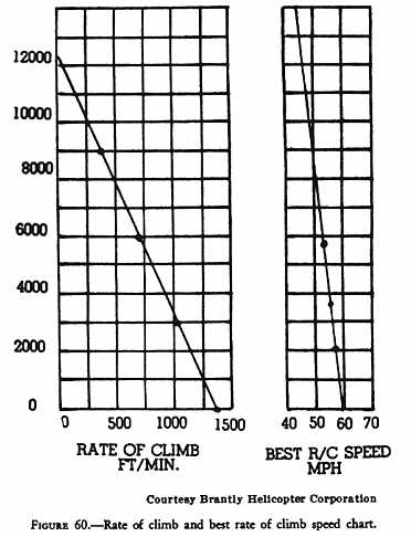 From the chart to the right in figure 60, you can determine the best rate of climb airspeed under the various density altitude conditions. From the density altitude at the left side of the chart, move horizontally across until the line intersects the diagonal line on the right-hand chart. From this point of intersection, move vertically downward to the bottom of the chart where you will read the best rate of climb speed in miles per hour.