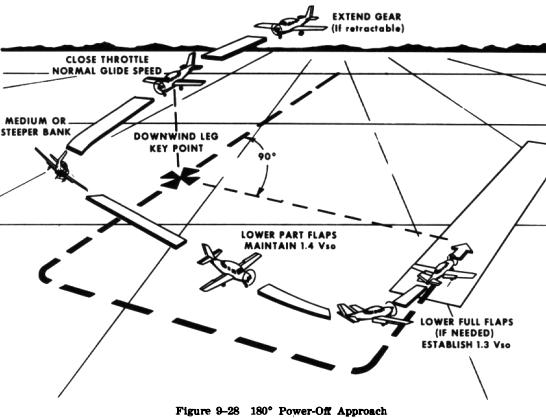 This approach is executed by gliding with the power off from a given point on a downwind leg to a preselected landing spot (Fig. 9-28). Actually it is an extension of the principles involved in the 90 degree power off approach just described. Its objective, then is to further develop judgment in estimating distances and glide ratios, in that the airplane must be flown without power from a higher altitude and through a 90 degree turn to reach the base leg position at a proper altitude for executing the 90 degree approach. Consequently, the 180 degree approach requires more planning and judgment than does the 90 degree approach.