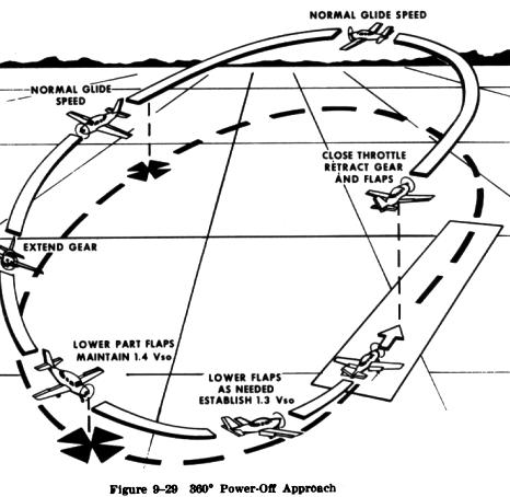 It is usually initiated from approximately 2,000 feet or more above the ground - where the wind may vary significantly from that at lower altitudes. This must be taken into account when maneuvering the airplane to a point from which a 90 degree or 180 degree power off approach can be completed. After the throttle is closed over the intended point of landing, the proper glide speed should immediately be established, and a medium banked turn made in the desired direction so as to arrive at the downwind key position opposite the intended landing spot. At or just beyond the downwind key position, the landing gear should be extended if the airplane is equipped with retractable gear. The altitude at the downwind key position should be approximately 1,000 to 1,200 feet above the ground. |