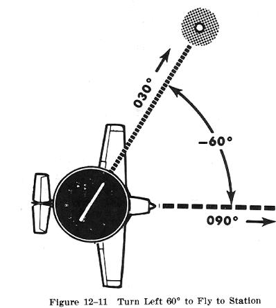To determine the Magnetic Bearing to a station on a fixed ADF azimuth dial, the pilot may imagine the airplane as being in the center of the fixed azimuth, with the nose of the airplane at the 0 degree position, the tail at the 180 degree position, and the left and right wingtips at the 270 degree and 090 degree positions, respectively. When the pointer is on the nose position, the airplane is heading straight to the station and the Magnetic Bearing can be read directly from the magnetic compass. If the pointer is left or right of the nose, the pilot should note the direction and number of degrees of turn that would (if the airplane were to be headed to that station) move the pointer to the nose position, and mentally apply this to the airplane's heading. For example, in Fig. 12-11, when the airplane is headed 090 degrees, the pointer is 60 degrees to the left of the nose position. A turn 60 degrees to the left would place the pointer on the nose position. If the airplane were to be turned 60 degrees to the left, the heading would be 030 degrees. The bearing from the station is the reciprocal - or 210 degrees.